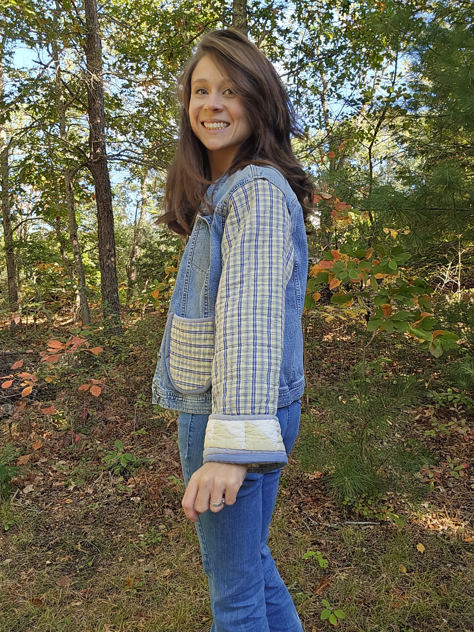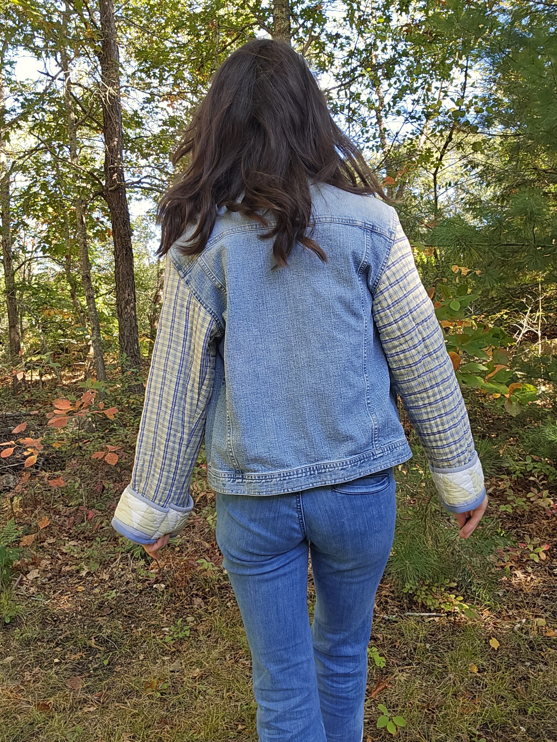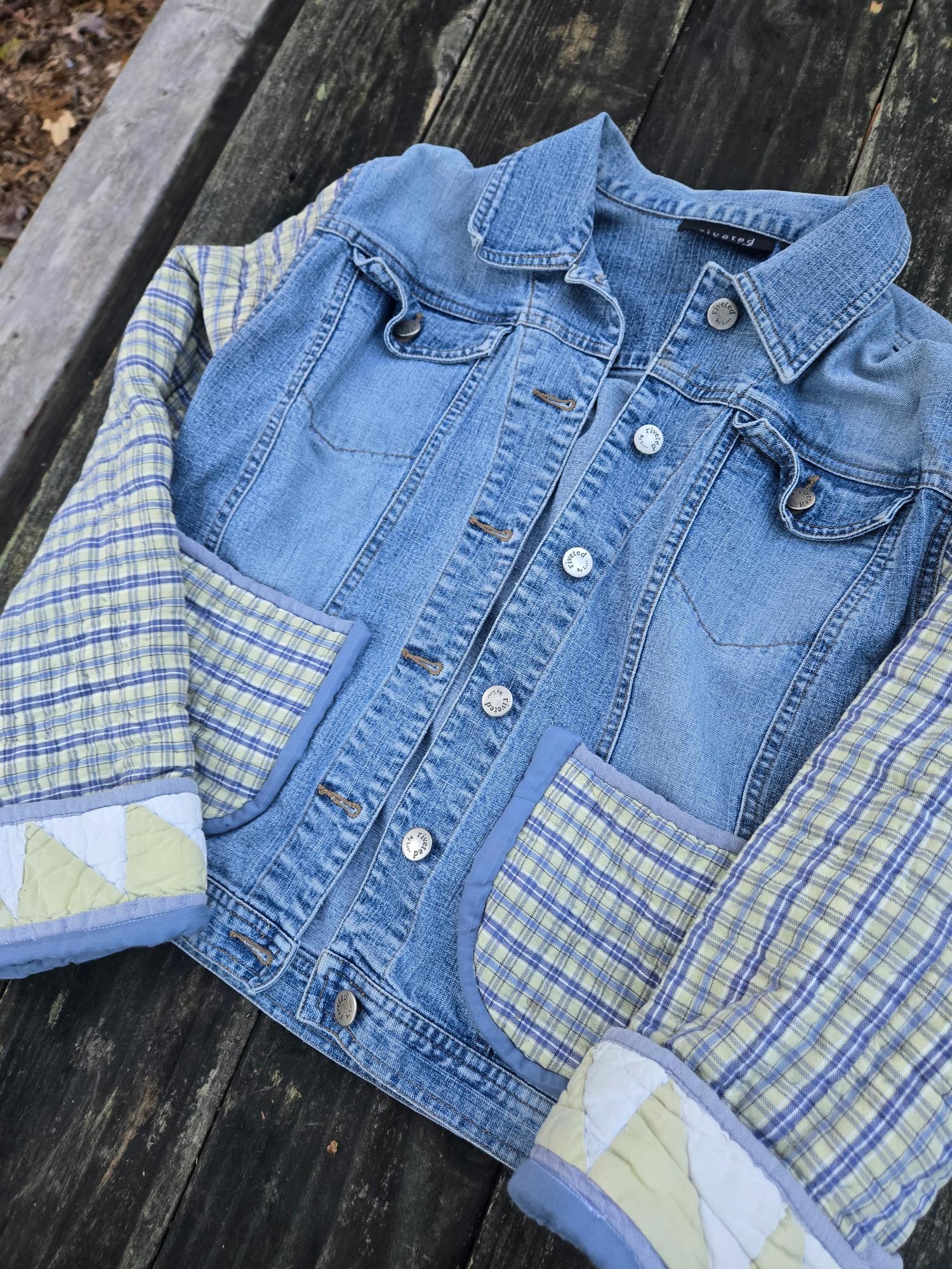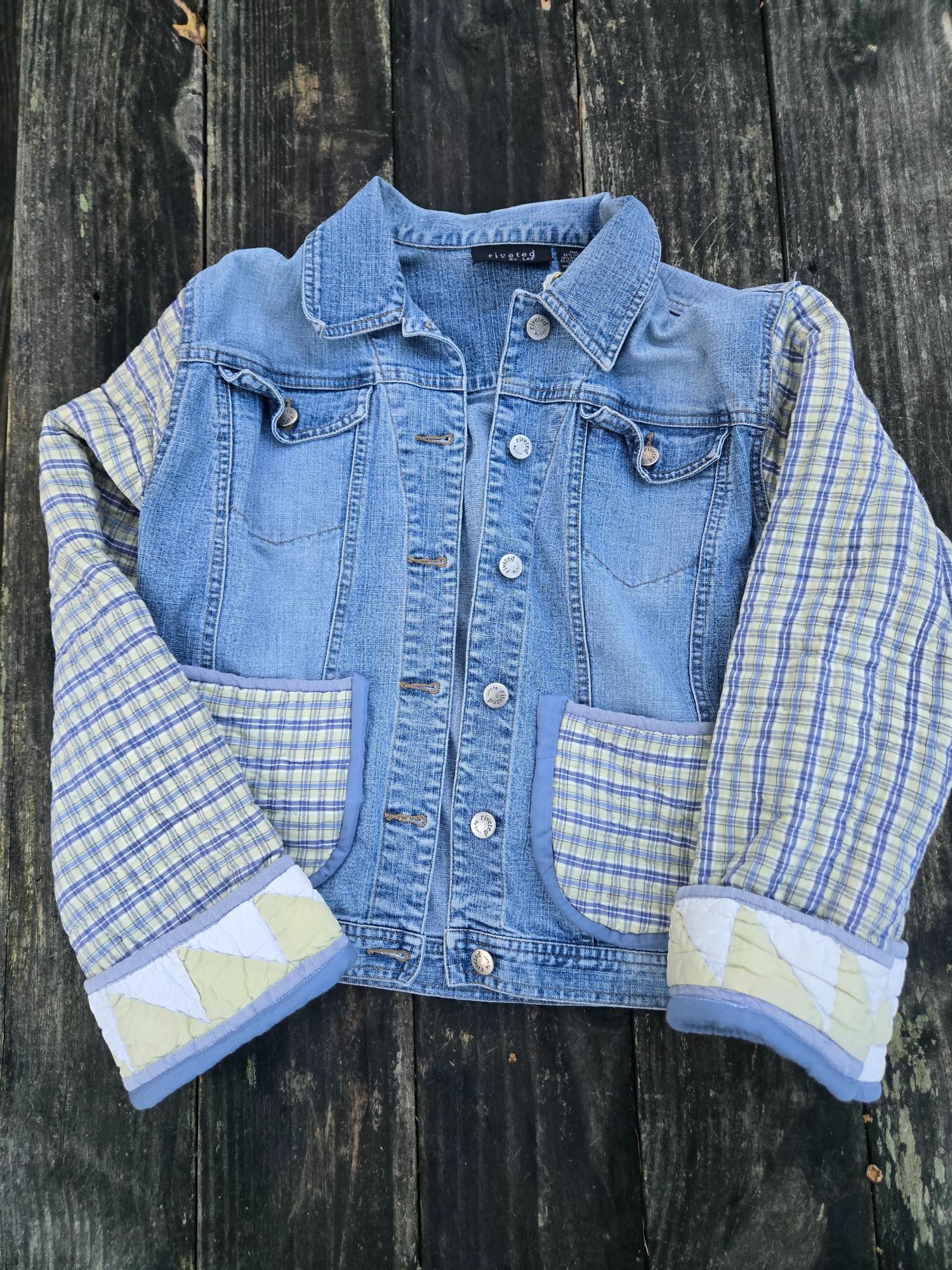 This is a size Medium light wash denim jacket with adorable plaid QuiltSleeves with cute cuff detailing. Serged seams and custom quilted pockets on the front!