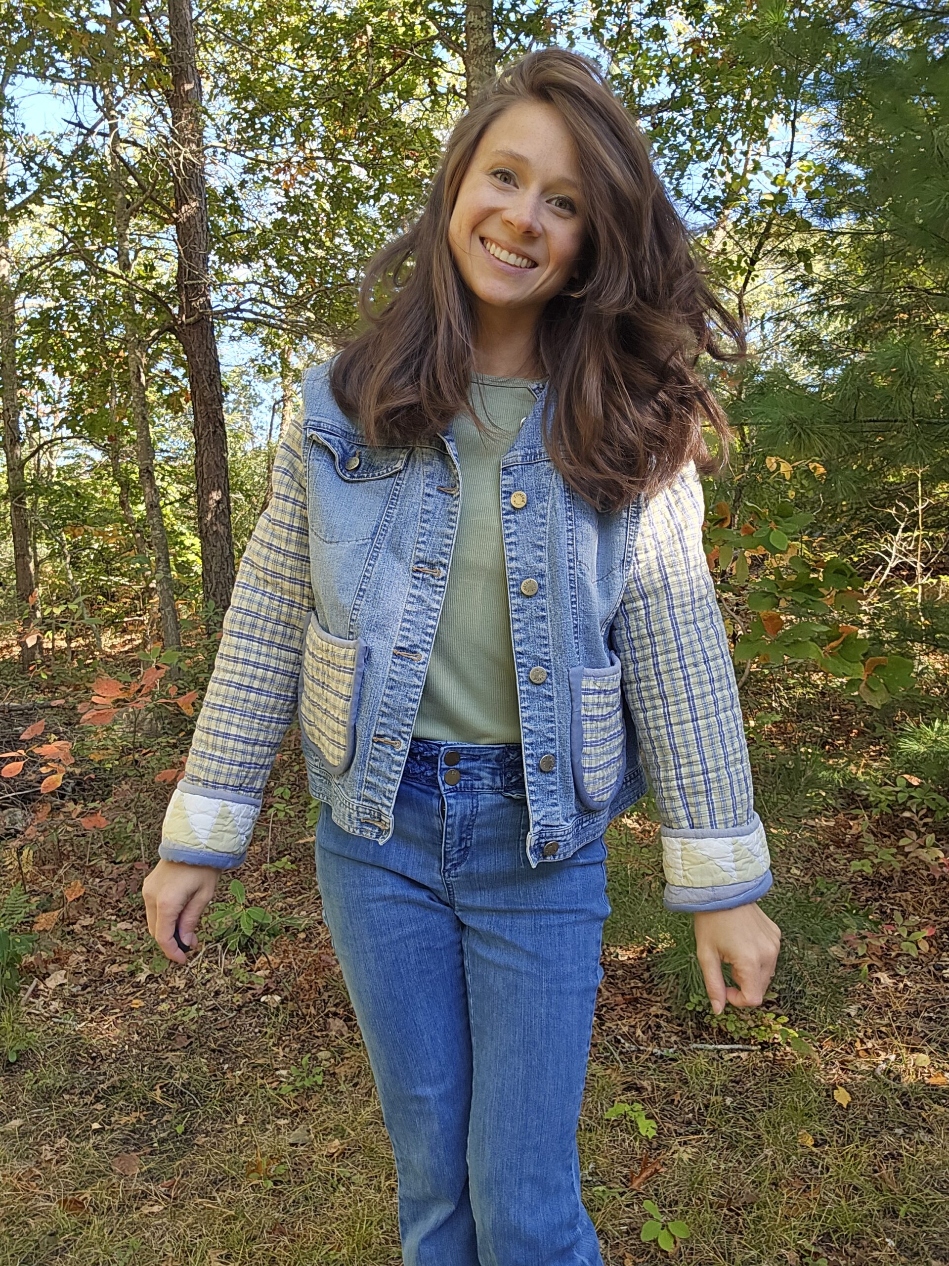 Light Wash Denim Jacket with Green/Blue QuiltSleeves: Medium