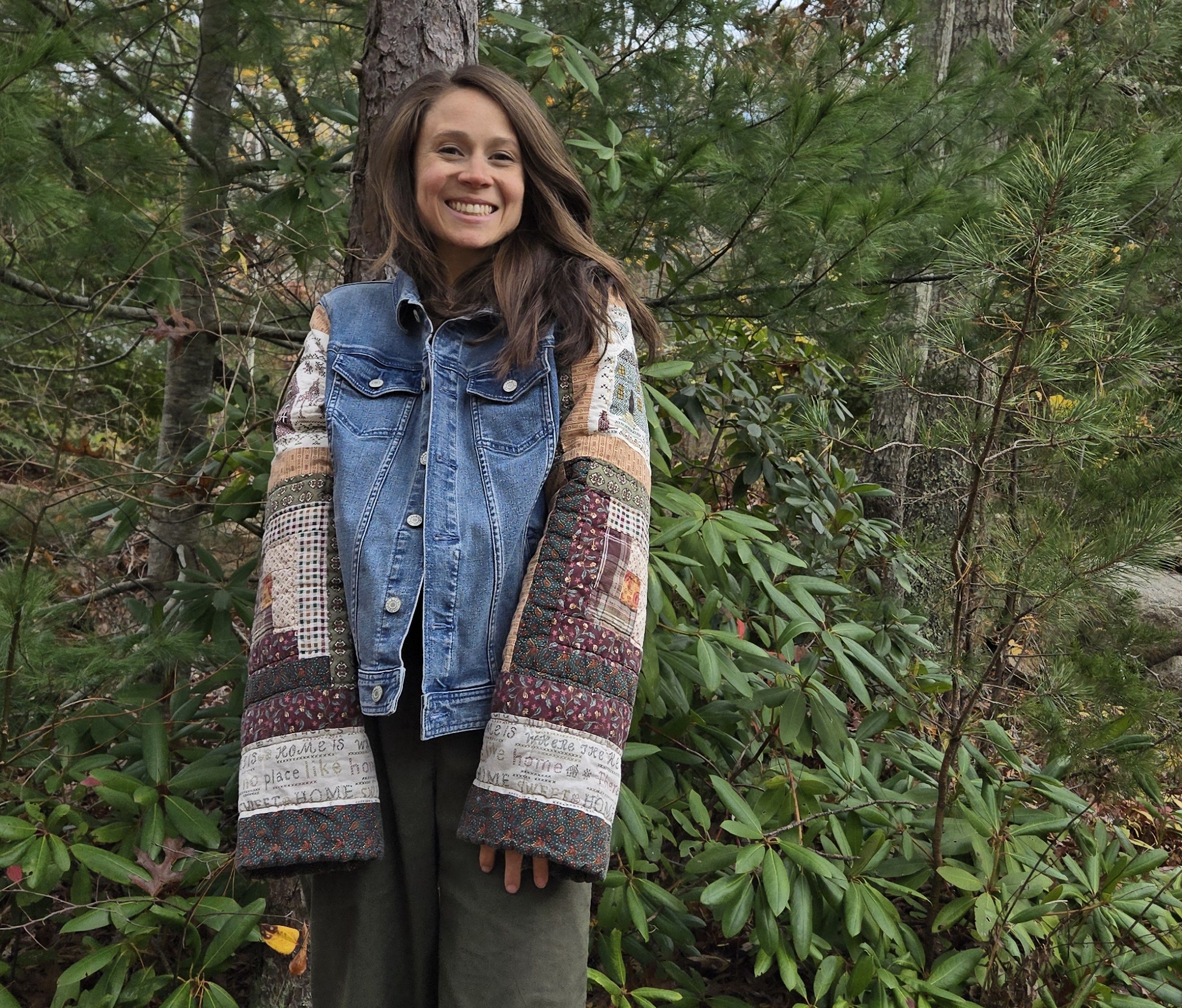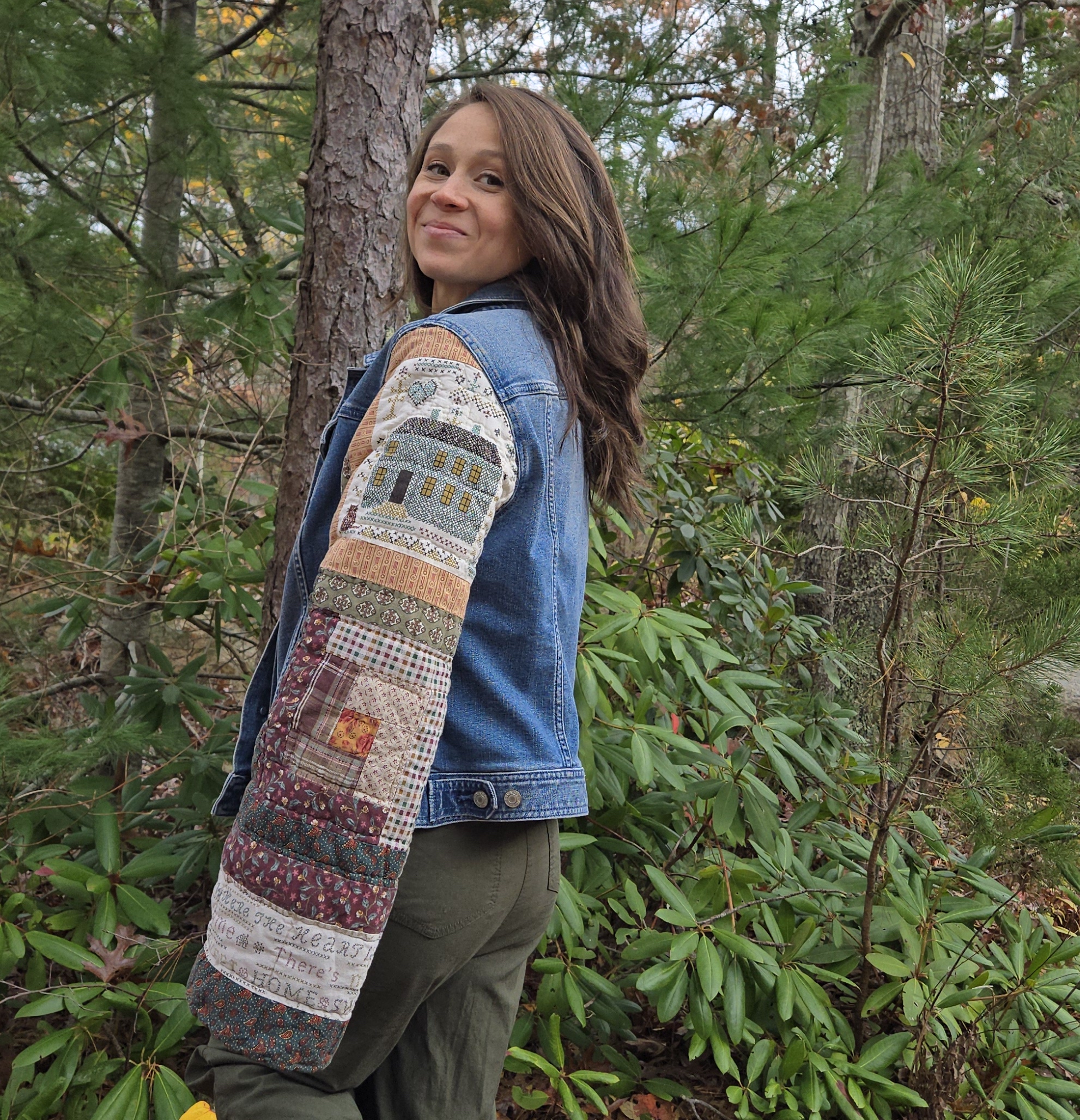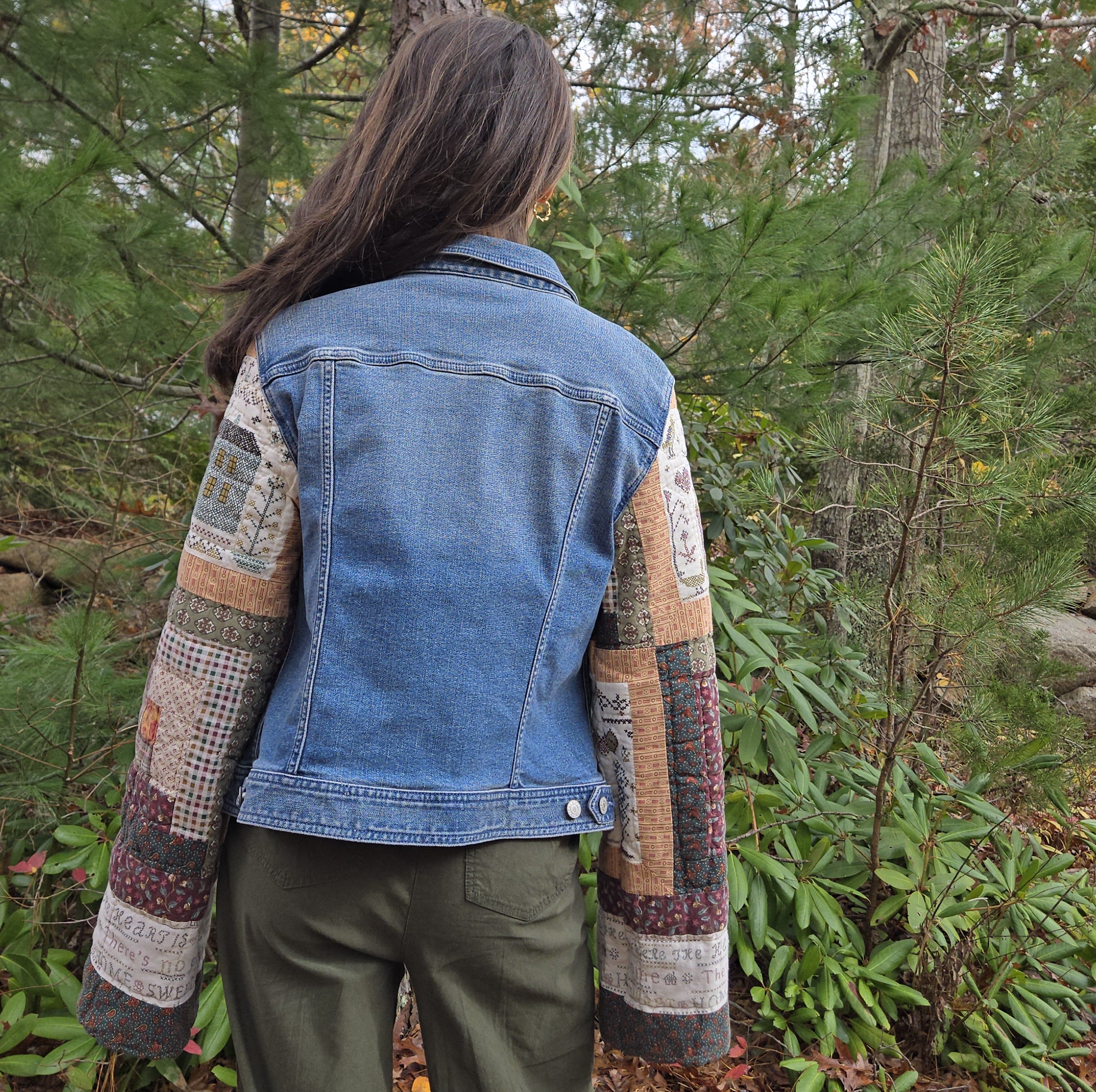 This is a custom-made jean jacket with quilt sleeves, size Small/Medium. The base is an Old Navy jean jacket, and the sleeves came from a vintage quilt. This is a one-of-a-kind piece, and no two of my jackets are alike.